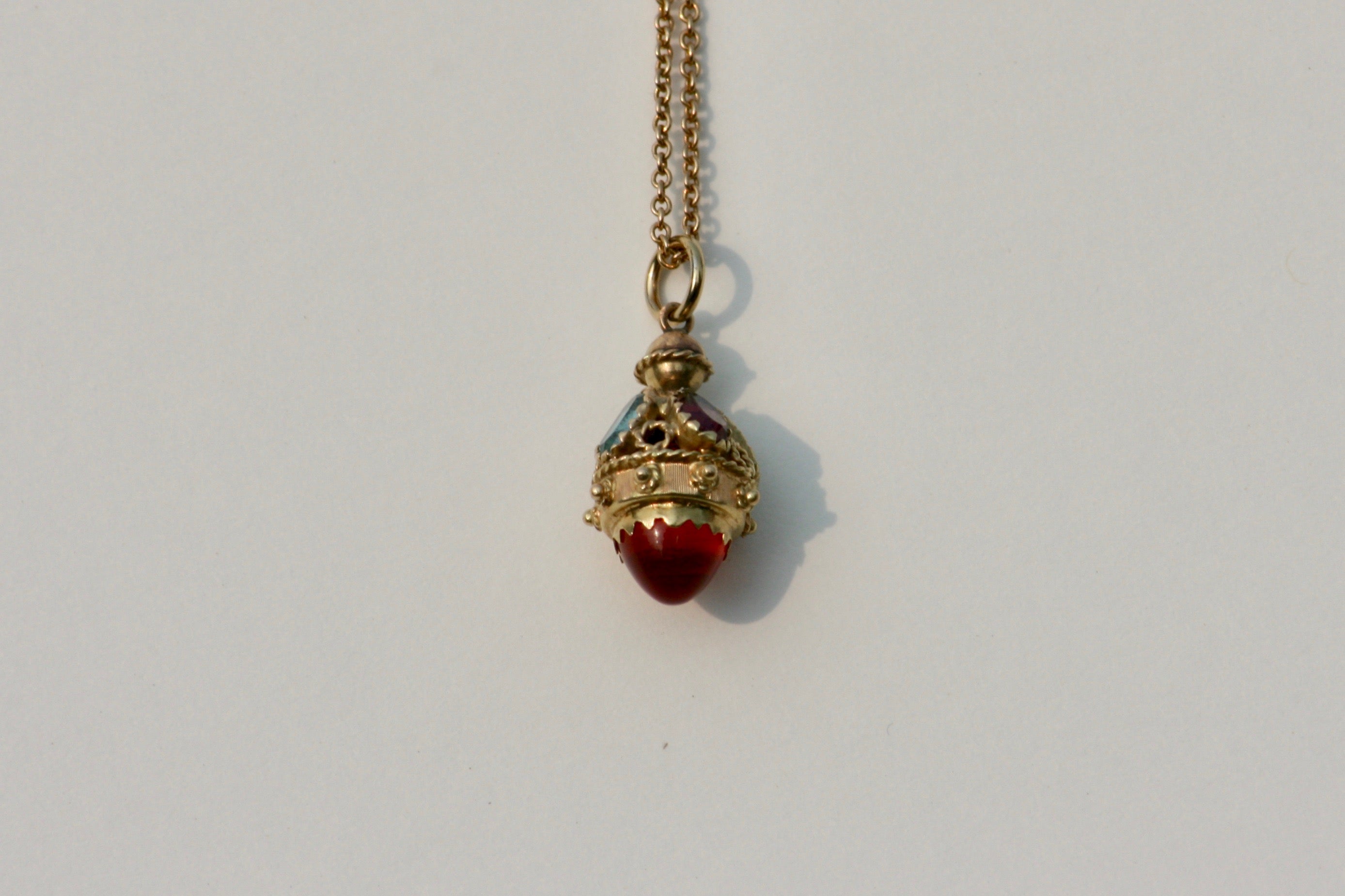 A multi gem antique Victorian charm set with 5 colorful gemstones. This pretty charm features decorative wire work as well as granulation balls.