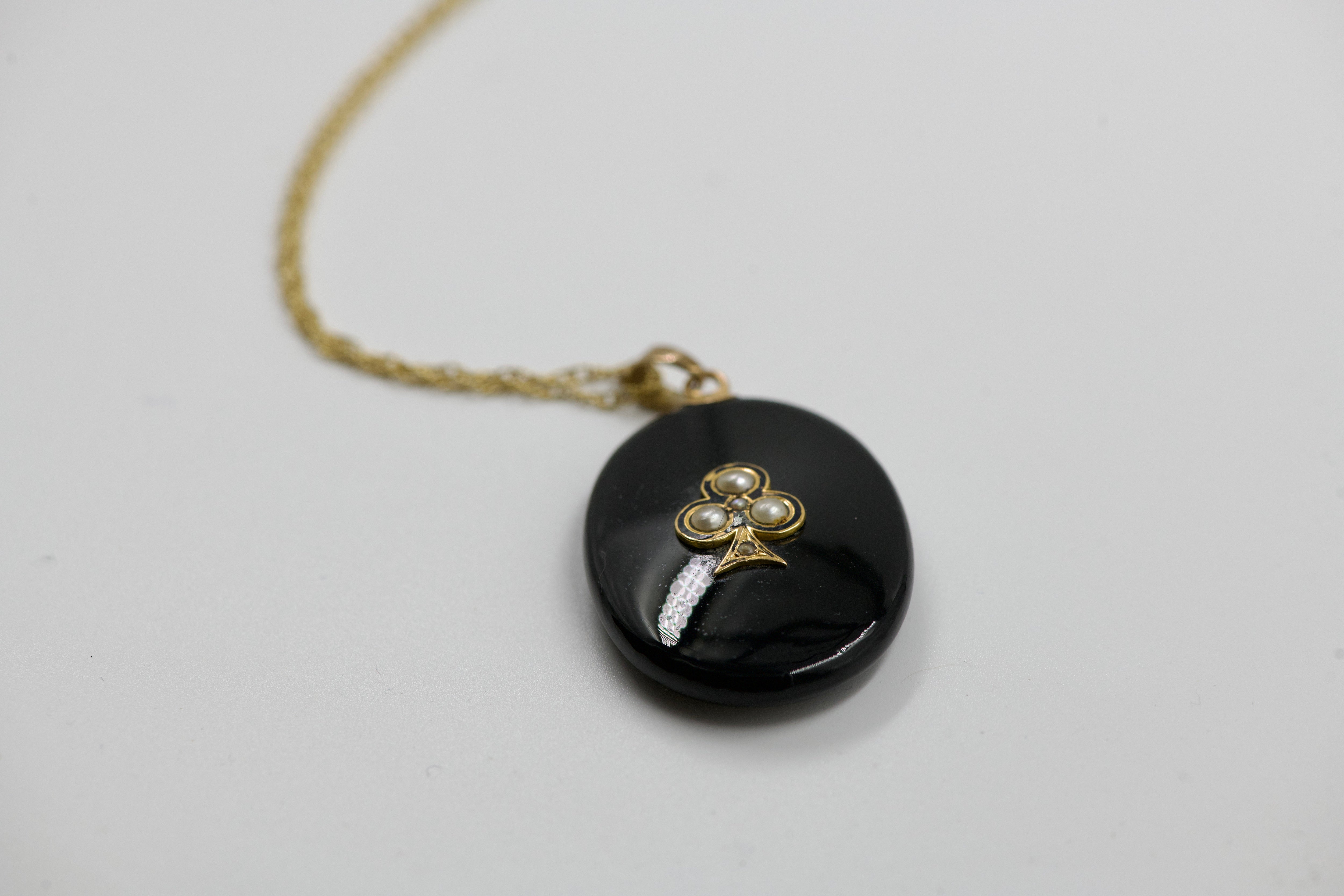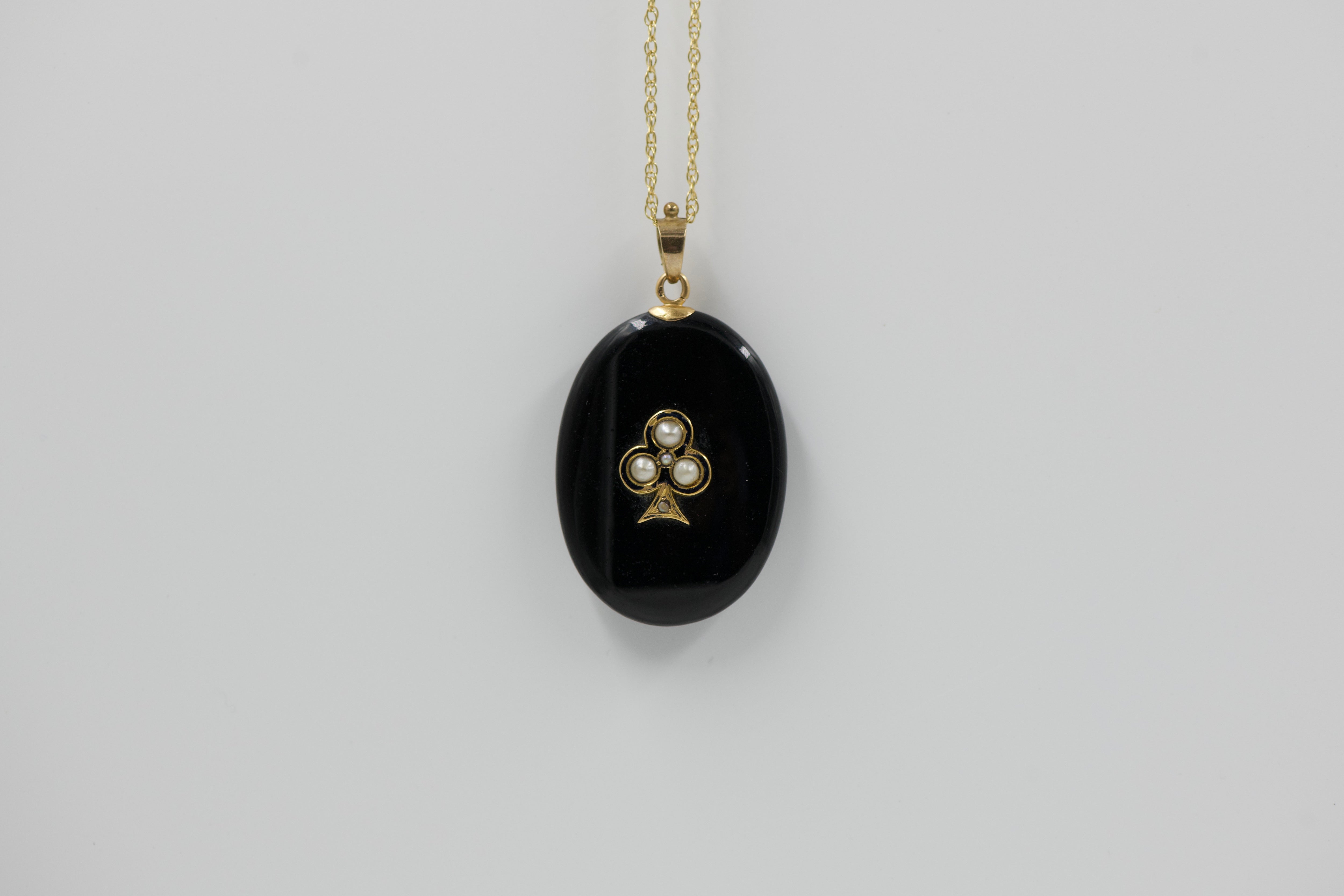 A pretty Onyx pendant featuring a central seed pearl flower and tiny granulation details around the frame.  Simple and beautiful, this piece is from the Victorian period.