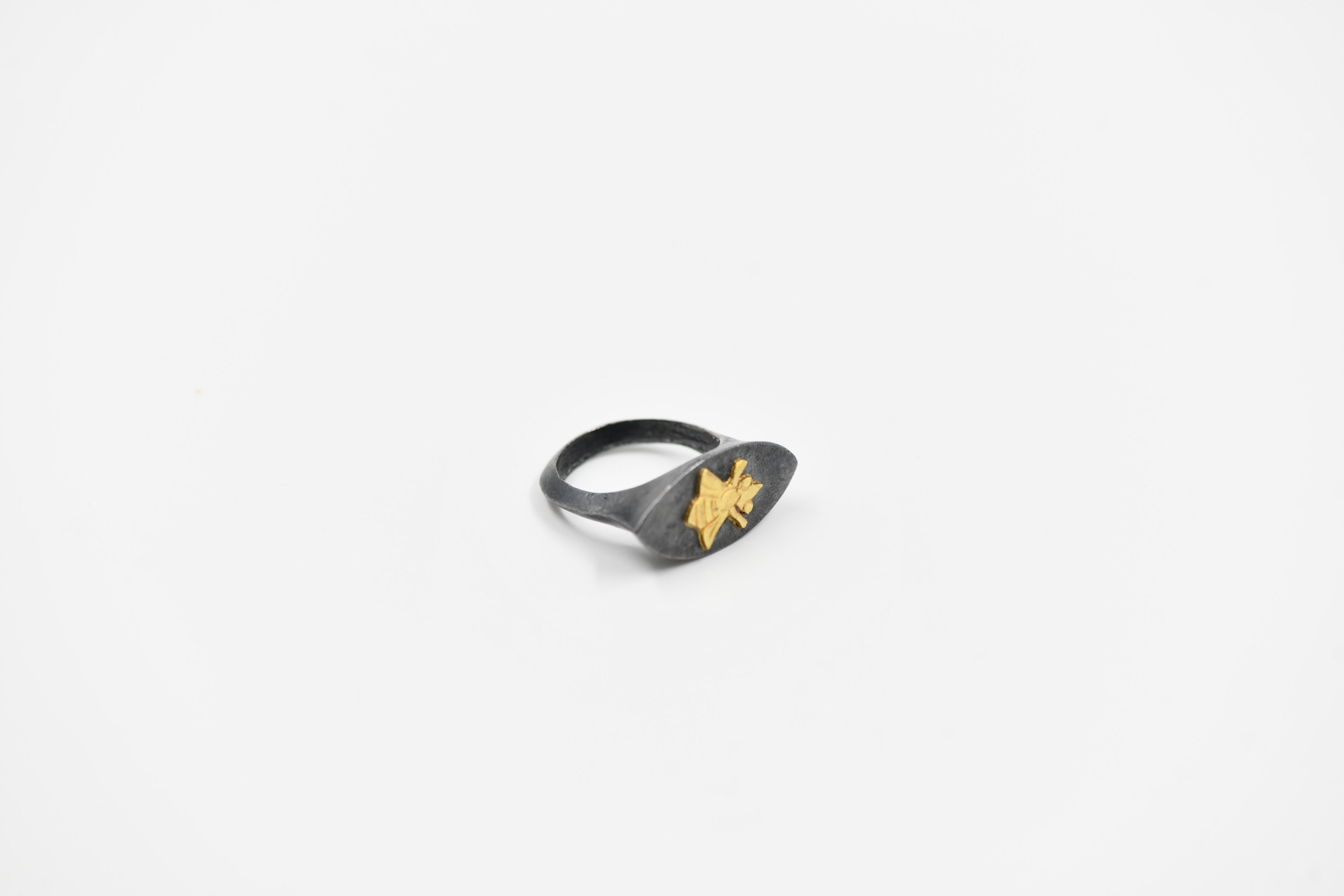 An oxidized silver ring featuring a carved 22k gold bee. A wonderful, stand out ring for all nature lovers.