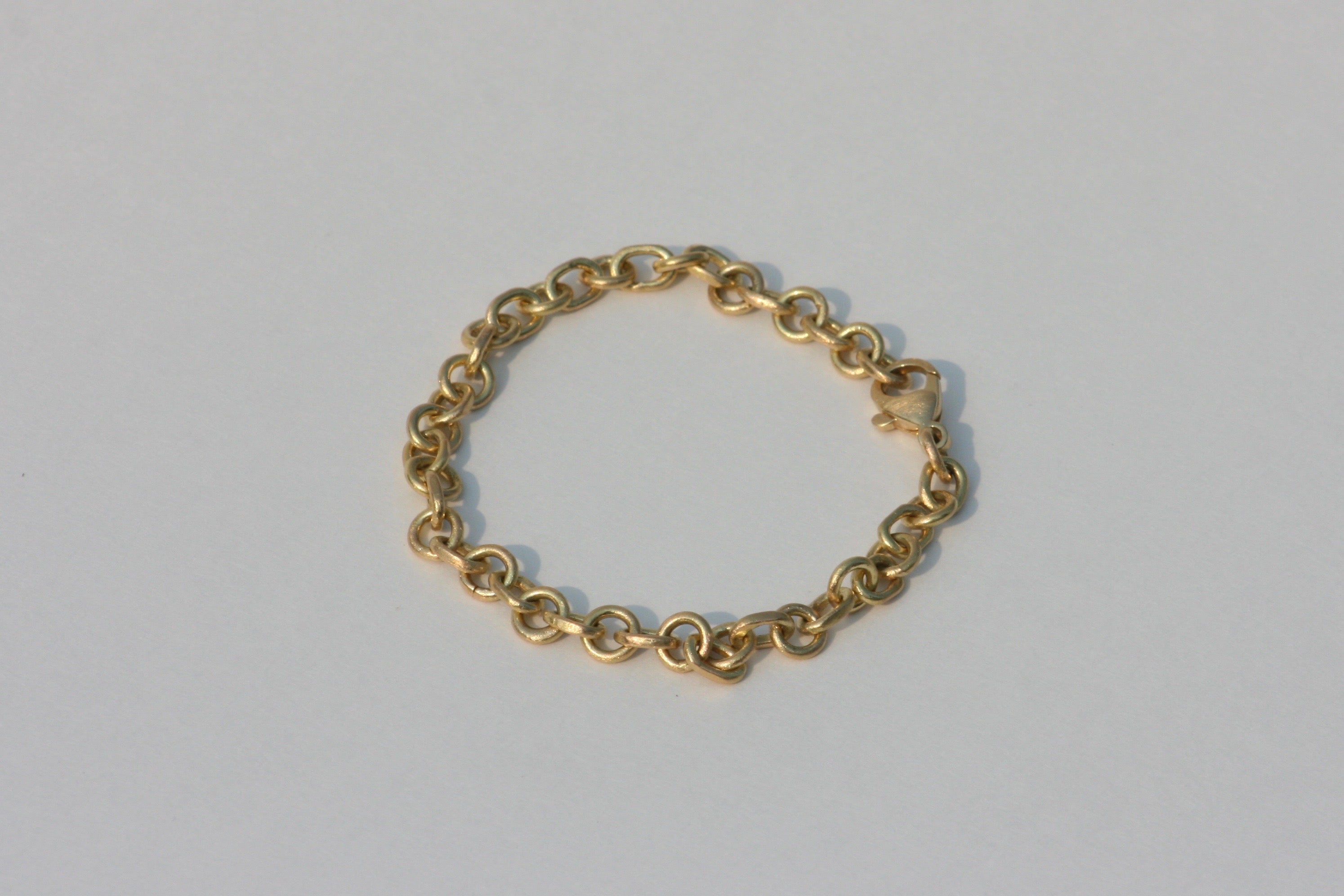 Handmade solid 18K gold chain link bracelet. Each link was individually formed and hammered to create this heavy, one of a kind heirloom.