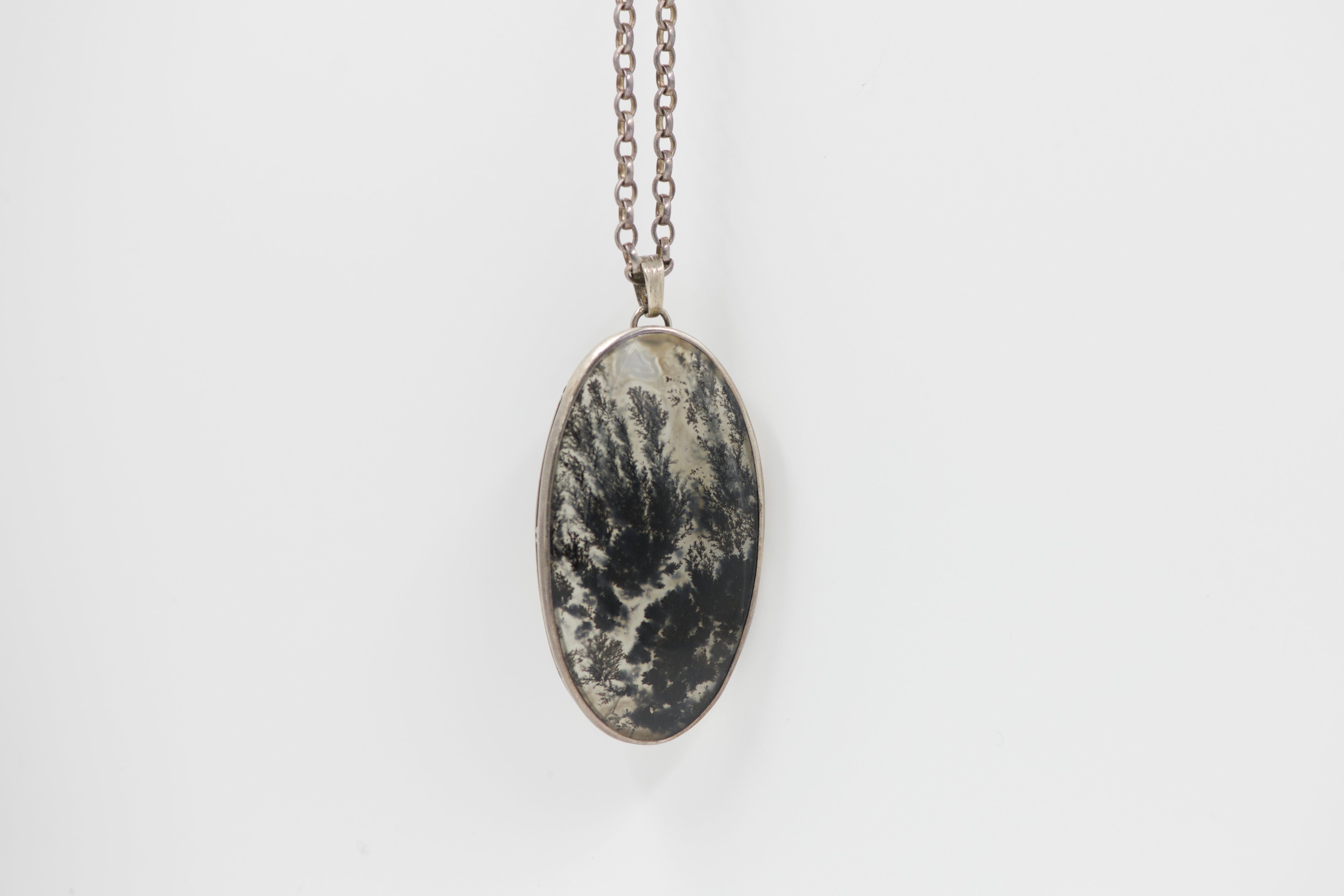 A beautiful, large plume agate in a fine silver setting. We’ve added a weighty antique belcher chain for a more dramatic effect.