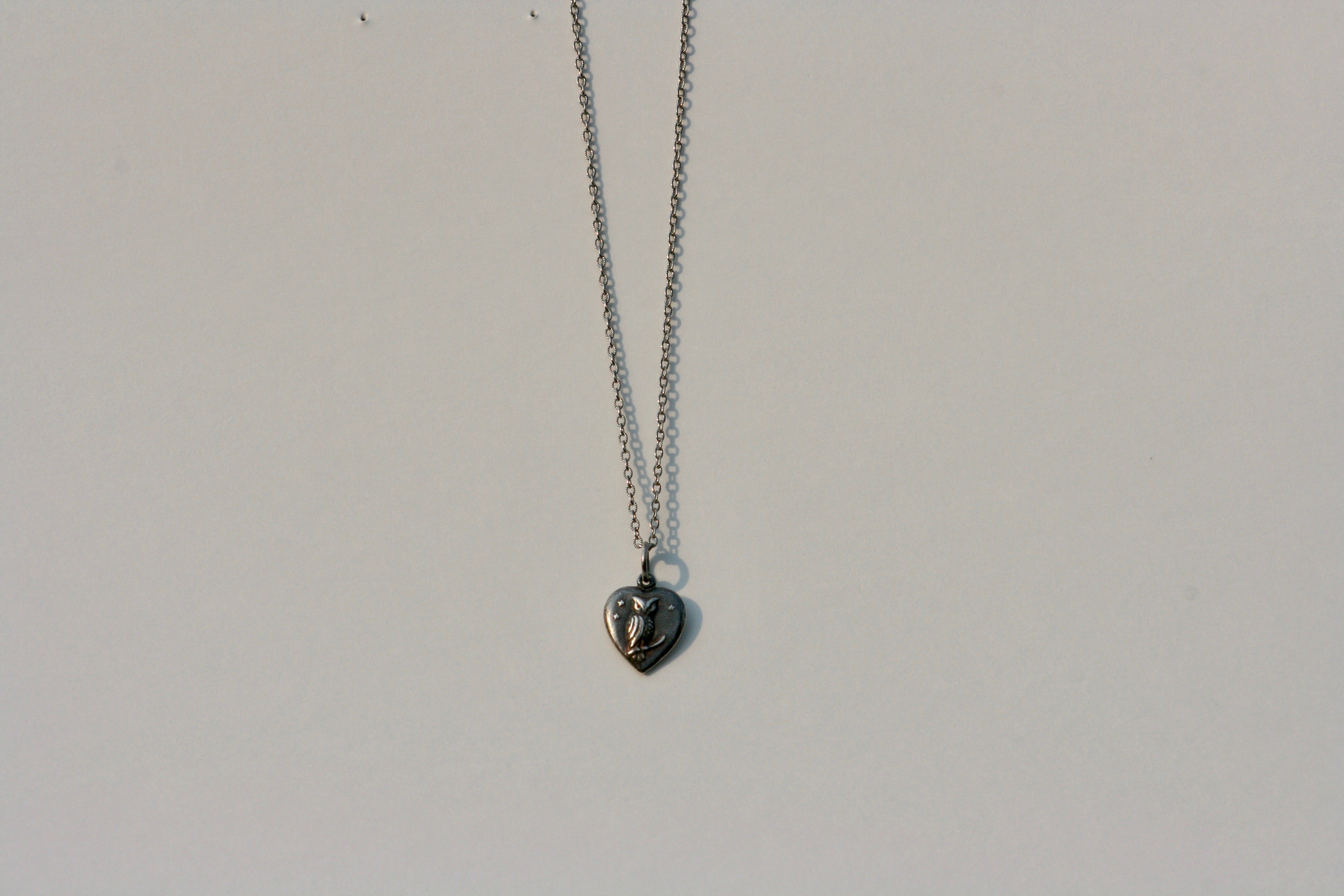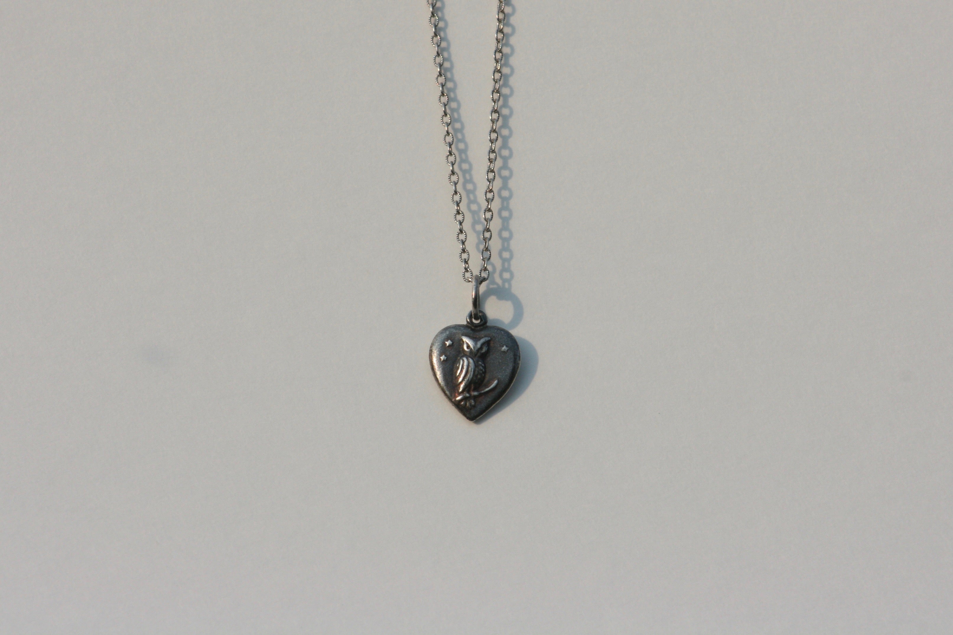 Solid silver heart pendant featuring an engraving of an owl. Pendant hangs from a textured, oxidized 18 inch chain.